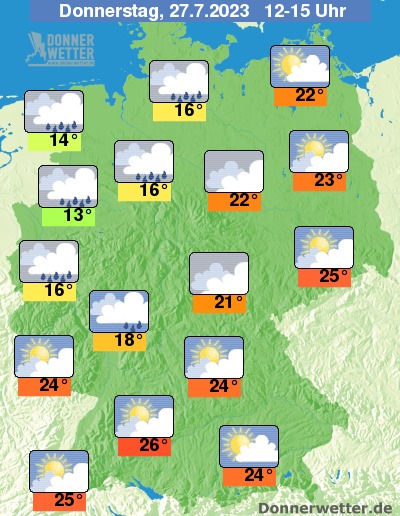 Heute Nachmittag ist es im Süden oft locker bis aufgelockert, in den östlichen Landesteilen anfangs noch teils aufgelockert bewölkt und trocken. Sonst ziehen jedoch von Westen kompakte Wolken auf und es fällt zeitweise Regen. Die Temperatur liegt bei 13 Grad im Münsterland und 26 Grad in Schwaben.