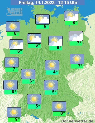 Heute Nachmittag zeigt sich die Südhälfte Deutschlands praktisch komplett sonnig. Weiter nach Norden hin ist es hingegen gebietsweise stark, teils aber auch locker bis wechselnd bewölkt. Es bleibt landesweit trocken bei 4 Grad im Thüringer Becken und 9 Grad am Oberrhein.
