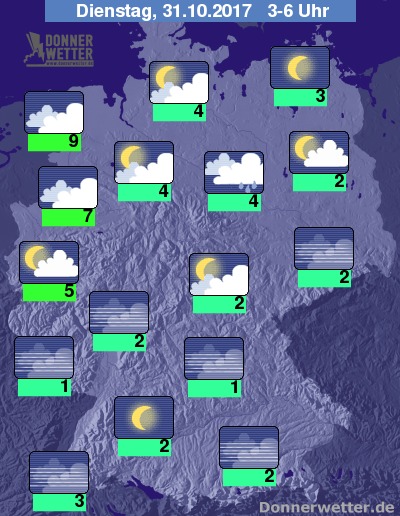 In der folgenden Nacht ist es im Norden zum Teil locker bewölkt oder klar, oft ziehen hier aber auch dichte Wolken durch, dabei fällt aber nur selten etwas Regen. Weiter nach Süden hin zeigt sich der Himmel zunehmend sternenklar, dazu bleibt es trocken. Stellenweise bildet sich Nebel oder Hochnebel. Die Temperatur sinkt auf 9 Grad in Emden und bis 1 Grad in Mittelfranken.