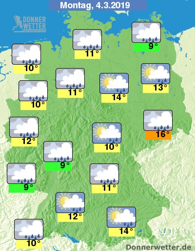 Am Montag halten sich verbreitet dichte Wolken und es fällt wiederholt Regen, zudem sind örtlich auch kräftige und teils gewittrige Schauer möglich, hier und da zeigen sich jedoch auch Auflockerungen. Die Temperatur steigt auf 9 Grad an der Ostsee und bis 16 Grad in Dresden. Es weht meist frischer bis starker, über der Nordhälfte vielerorts stürmischer und auf den Bergen und an der See auch orkanartiger Wind.