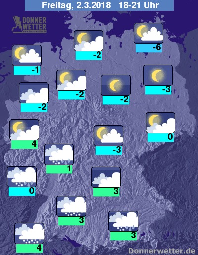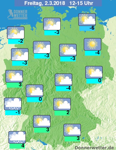 Durch den Einfluss milderer Luftmassen steigt das Thermometer am Nachmittag im Südwesten auf bis zu 4 Grad. An der Nordsee bleibt es bei Werten um die -6 Grad hingegen vorerst noch frostig kalt.
