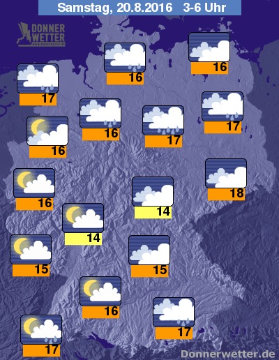 In der folgenden Nacht ist es über dem Westen des Landes meist bedeckt und es fällt noch Regen, die dichten Wolken und der zeitweilige Regen breiten sich im weiteren Verlauf dann auch auf den Norden und Osten Deutschlands hin aus. Im Westen lockert es gegen Morgen meist wieder auf und dann bleibt es hier weitgehend trocken. Im Süden ist es teils aufgelockert, teils stark bewölkt, jedoch überwiegend trocken. Die Temperatur sinkt auf 18 Grad in Dresden und bis 14 Grad am Westerwald.
