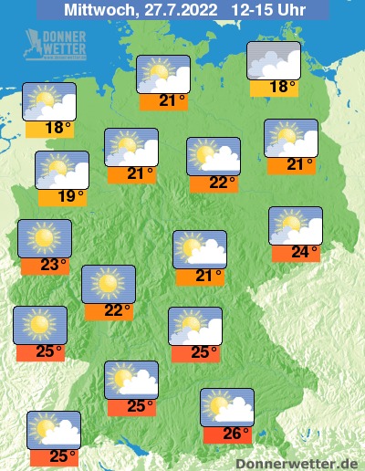 Heute Abend ist es über der breiten Mitte des Landes größtenteils sonnig. Im Norden ist es meist locker, teils auch aufgelockert bewölkt. Im Süden ist es wechselnd und teils auch stark bewölkt. Es bleibt weitgehend trocken bei 19 Grad in Cuxhaven und bis 27 Grad in München.