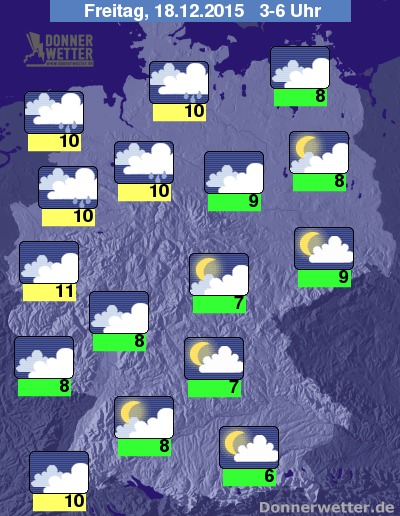 Am Freitag ist es im äußeren Süden zunächst oft aufgelockert oder stark bewölkt und weitgehend trocken, im übrigen Land halten sich zumeist dichte Wolken und es fällt immer wieder Regen. Im Tagesverlauf ziehen auch im Alpenvorland Regenwolken auf, während die Niederschläge vom Westen Deutschlands her wieder abklingen und es nachfolgend auch gebietsweise auflockert. Bis zum Abend regnet es nur noch am Alpenrand, sowie im äußeren Osten des Landes. Vor allem im Norden bleibt es jedoch meist trüb. Die Temperatur steigt auf 10 Grad in Unterfranken und bis 12 Grad am Niederrhein.