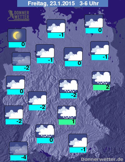 Am Freitag bleiben die Wolken vor allem im Süden und Osten Deutschlands weitgehend dicht und hier fällt zeitweise Schnee, vereinzelt auch Schneeregen oder Regen. Auch in der Nordwesthälfte bleibt es mehrheitlich stark bewölkt, hin und wieder, und hierbei insbesonders im Nordwesten kann sich die Sonne aber zeigen. Dabei bleibt es trocken. Die Höchstwerte erreichen -1 Grad im Vogtland und bis etwa 3 Grad in München.