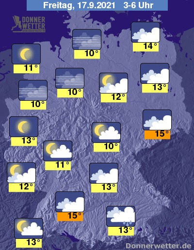 In der Nacht zum Freitag zeigt sich der Himmel über dem Westen und dem Norden Deutschlands meist sternenklar, dichte Wolken halten sich vor allem über dem Süden und Osten des Landes, dabei bleibt es aber weitgehend trocken. Am Alpenrand kann jedoch etwas Regen fallen. Die Temperatur sinkt auf 15 Grad in Dresden und bis 10 Grad in Hamburg.