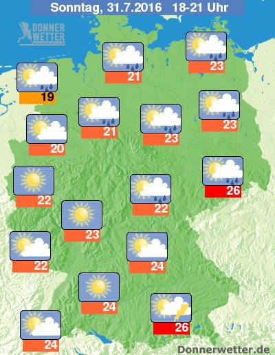Heute Abend sind im Alpenvorland bei oft dichten Wolken weitere Schauer und örtliche Gewitter möglich, sonst heitert es im Süden und Westen zunehmend auf und oft wird es sogar sonnig. Deutlich wechselhafter mit gebietsweisen Schauern und lokalen Gewittern bleibt es über dem Norden und Osten der Bundesrepublik, zwischendrin kann sich jedoch auch mal die Sonne zeigen. Die Temperatur liegt bei 19 Grad an der Wesermündung und um 26 Grad in der Lausitz.
