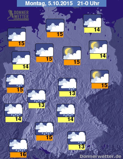 Heute Abend breiten sich die dichten Regenwolken aus Südwesten weiter nach Nordosten hin aus und erreichen bis Mitternacht etwa eine Linie vom Rheinland über Hessen bis nach Ostbayern, dazu fällt teils kräftiger und langanhaltender Regen. Weiter nach Nordosten ziehen zwar meist viele und oft dichte Wolken durch, dazu bleibt es jedoch trocken. Die Abendtemperatur liegt bei 16 Grad im Oberrheingraben und um 13 Grad im Eichsfeld.