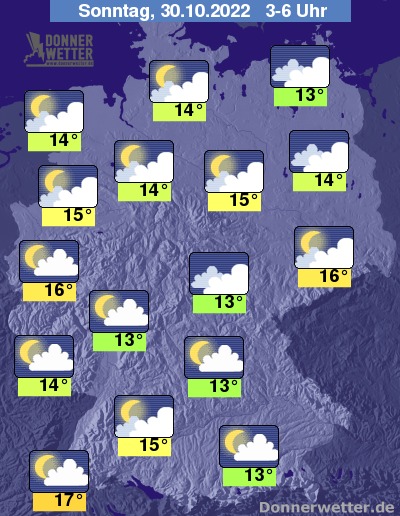 In der Nacht zum Sonntag ist der Himmel über dem Süden und Westen oft nur locker, sonst dagegen überwiegend noch aufgelockert oder eher schon stark bewölkt. Es bleibt landesweit trocken bei Tiefstwerten von 17 Grad in Freiburg und etwa 13 Grad in Jena.