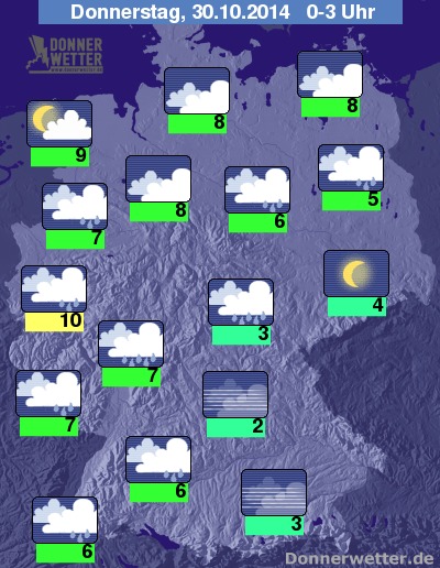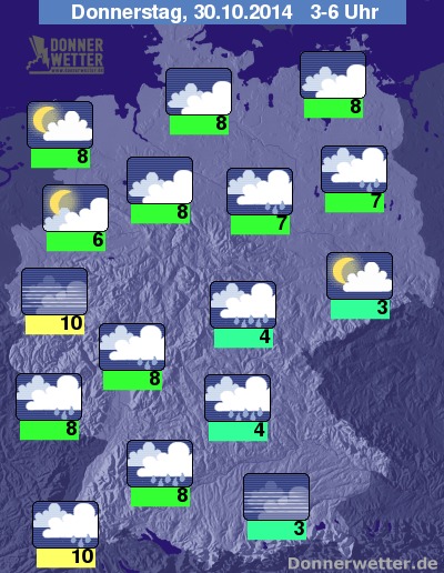 Während am frühen Donnerstagmorgen die Schauer im Nordwesten allmählich abklingen, fallen in einem langen Streifen vom Schwarzwald bis in die Uckermark örtliche Niederschläge. Regional kann sich Nebel bilden, Tiefstwerte um 10 bis 3 Grad.