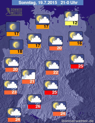Heute Abend klart der Himmel besonders über dem Nordwesten der Republik verbreitet auf, aber auch sonst lockert es über der Nordwesthälfte meist auf und es bleibt trocken. In Süddeutschland ist es zum Teil aufgelockert, häufig aber auch stark bewölkt und es sind einzelne Schauer, am Alpenrand auch Gewitter möglich. Die Abendtemperatur liegt bei  26 Grad in Stuttgart und etwa 12 Grad an der Müritz.