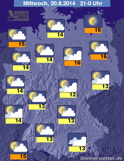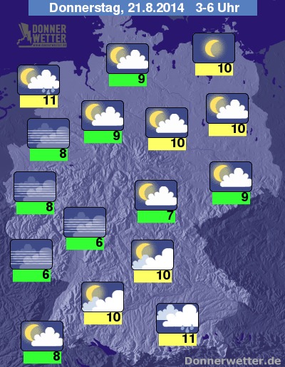 In der Nacht zum Donnerstag halten sich am Alpenrand und in einem Streifen von der Nordsee bis zum Niederrhein häufig dichte Wolken und es fällt zeitweise Regen, in den übrigen Landesteilen ist es dagegen meist locker oder aufgelockert bewölkt, an der Ostsee klar, und es bleibt weitgehend trocken. Die Temperatur sinkt auf 11 Grad in München und 6 Grad im Westerwald.