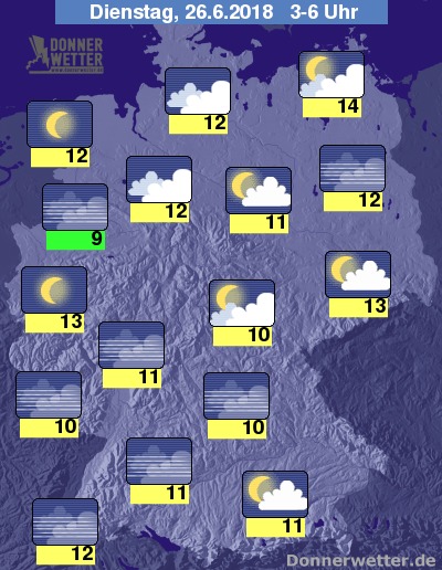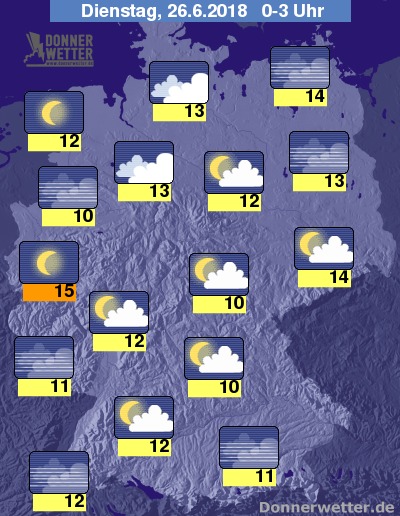 Die Temperaturen sinken im Nachtverlauf auf Tiefstwerte um 14 bis 9 Grad C.