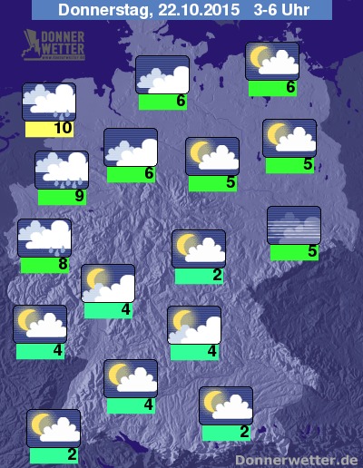 In der kommenden Nacht ziehen im Westen und Nordwesten dichte Wolken mit Regen herein, sonst ist der Himmel hingegen verbreitet locker oder aufgelockert bewölkt und es bleibt trocken. Die Temperatur sinkt auf 10 Grad an der Ems und bis 2 Grad in Konstanz. Stellenweise bildet sich Nebel oder Hochnebel, dabei ist Glätte durch Rauhreif möglich.