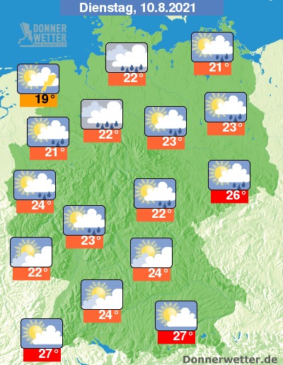 Am Dienstag ist es über der Nordhälfte teils stark, teils auch aufgelockert bewölkt, dabei bilden sich vielerorts Schauer, örtlich sind auch Gewitter möglich. Im übrigen Land ist es zum Teil heiter, teils ziehen einige Wolken durch, dabei bleibt es trocken. Die Temperatur erreicht 19 Grad im nördlichen Emsland und bis 27 Grad am Oberrhein.