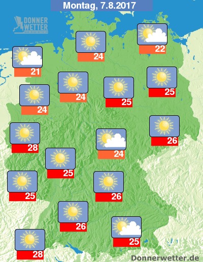 Ein freundlicher und angenehmer Sommertag erwartete Deutschland heute. Von einem heiteren Himmel strahlt verbreitet die Sonne. Nach frischem Morgen erwärmt sich die Luft im Tagesverlauf auf 22 bis 27 Grad. An der Küste und auf den Bergen bleibt es etwas kühler. Am Oberrhein können die Temperaturen noch etwas höher klettern. Der Wind ist meist nur schwach bis mäßig. Gegen Abend ziehen im Westen und Nordwesten lockere Wolkenfelder auf.
