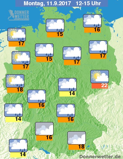 Am Mittag zeigt sich der Himmel über weiten Landesteilen dicht bewölkt oder bedeckt, ein paar freundlichere Phasen gibt es vor allem im Nordwesten sowie in der Lausitz. Mit Schauern muss bei Höchstwerten um 14 Grad C im Thüringer Wald und um 22 Grad C in Görlitz verbreitet gerechnet werden.