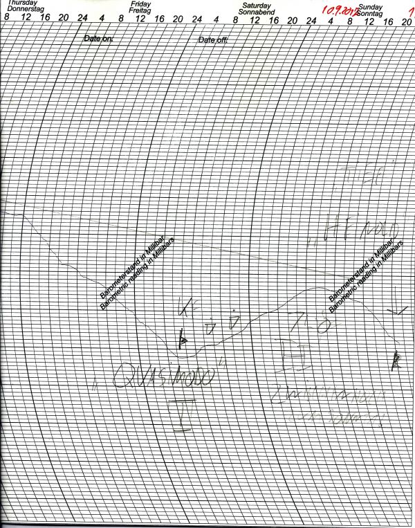 Unser Schrieb zeigt den Luftdruckverlauf an unserer Wetterstation in Bonn zwischen letzter Woche Donnerstag und Sonntag. Zu erkennen ist unter anderem die Kaltfront von Tief "Quasimodo" am Freitag / Samstag sowie das Zwischenhoch von Sonntag, welches weiten Landesteilen freundliche Stunden bescherte.