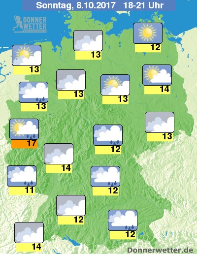 Heute Abend ist es im Nordosten meist heiter bis sonnig und trocken, im Norden und Osten ist es noch oft stark bewölkt, jedoch schon weitgehend trocken. Im übrigen Bundesgebiet dominieren mehrheitlich dichte Wolken und es bilden sich gebietsweise Schauer. Die Temperatur liegt bei 11 Grad am Pfälzer Wald und etwa 17 Grad in Köln.