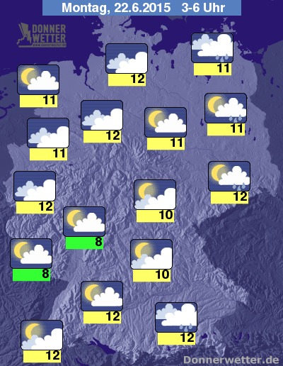 Am Montag bleibt es den Tag über verbreitet stark bewölkt und es zeigen sich nur selten Auflockerungen am Himmel. Dazu fällt immer wieder, oft auch schauerartiger Regen. Im Norden und Westen sind zudem Gewitter möglich. Die Temperatur steigt auf teils nur 11 Grad im Westerwald und bis 23 Grad in München.
