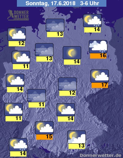 In der folgenden Nacht sind am Oberrhein, sowie von Brandenburg bis zur Ostsee gebietsweise Schauer und auch Gewitter möglich. Im übrigen Land zeigt sich der Himmel dagegen meist nur locker bewölkt oder sogar sternenklar, dazu bleibt es trocken. Die Temperatur sinkt auf 17 Grad in der Lausitz und bis 11 Grad im Saargau.