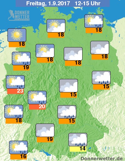 Freundliche Abschnitte vor allem im Westen, um 14 bis 24 Grad C in der Spitze.