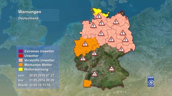 Unsere Karte zeigt die aktuelle Unwetterwarnlage für Deutschland am heutigen Montag (Stand: 11:16 Uhr). Vor allem für die Nord- und Osthälfte hat der DWD eine Vorabinfo Unwetter (keine Unwetterwarnung!) herausgegeben.