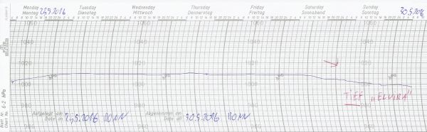 Der Schrieb zeigt den Luftdruckverlauf im Zeitraum 23.05. - 30.05. an unserer Wetterstation in Bonn. Deutlich zu erkennen ist Tief "Elvira", welches am Wochenende vor allem dem Süden des Landes verheerende Unwetter brachte.
