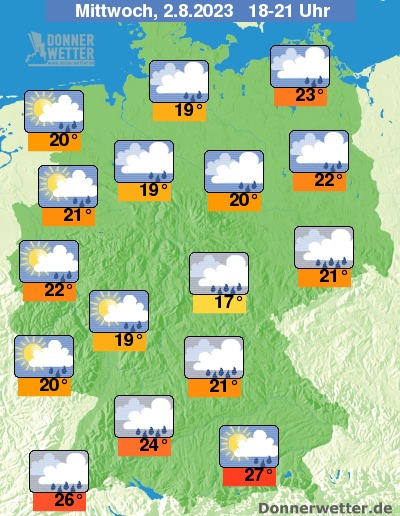 Heute Abend kann sich vor allem nach Westen hin häufiger die Sonne blicken lassen, jedoch ziehen auch weiterhin vielerorts kompakte Wolken durch und es bilden sich einzelne Schauer, örtlich auch Gewitter. Die Temperatur liegt bei 17 Grad in Jena und 27 Grad in München.