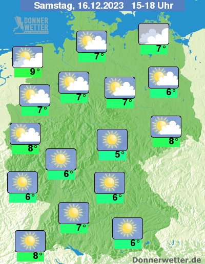 Am Nachmittag zeigt sich der Himmel über dem Norden wechselnd oder stark bewölkt, vereinzelt kann auch etwas Regen oder Sprühregen fallen. Sonst ist es abseits von zähen Nebel- oder Hochnebelfeldern teils heiter, im Süden auch sonnig und es bleibt trocken.