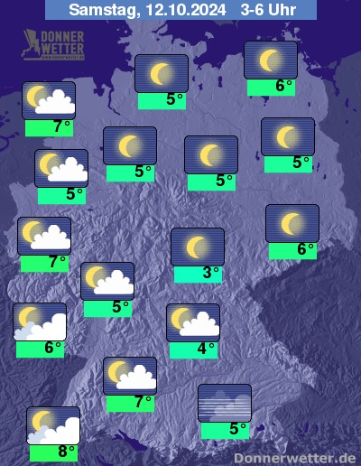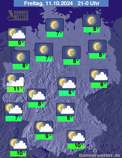 In der Nacht zum Samstag zeigt sich der Himmel zunächst verbreitet sternenklar oder nur gering bewölkt, gebietsweise kann sich Nebel bilden. Im Nachtverlauf nimmt die Bewölkung von Südwesten zu, es bleibt aber trocken.