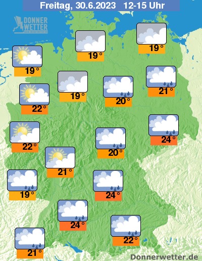 Heute Nachmittag bilden sich über der Südosthälfte unter kompakten Wolken verbreitet Schauer, ganz vereinzelt sind auch kurze Gewitter möglich. Weiter nach Nordwesten ist es teils stark, teils aufgelockert bewölkt und weitgehend trocken. Die Temperatur liegt bei 19 Grad in Hamburg und 24 Grad in Stuttgart.