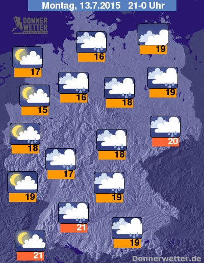 Heute Abend zeigt sich der Himmel häufig stark, gebietsweise aber auch aufgelockert bewölkt. In den westlichsten Landesteilen bleibt es dabei zumeist trocken, im großen Rest des Landes fällt jedoch zeitweise Regen oder es bilden sich einzelne Schauer. Die Abendtemperatur liegt bei 21 Grad in Freiburg und um 15 Grad am Niederrhein.
