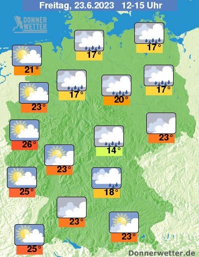 Heute Nachmittag zeigt sich über den westlichen Landesteilen wieder häufig die Sonne und es bleibt trocken. Über der Osthälfte Deutschlands bleibt es dagegen weitestgehend dicht bewölkt und es fällt vielerorts Regen. Die Temperatur liegt bei 14 Grad im Vogtland und 26 Grad im Rheinland.