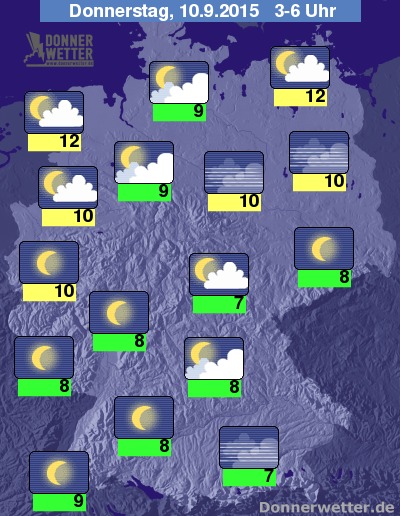 In der Nacht zum Donnerstag zeigt sich besonders über der Südhälfte Deutschlands ein oft sternenklarer Himmel, gebietsweise halten sich aber auch einige, teils dichtere Wolken. Weiter nach Norden hin ist die Bewölkung meist locker oder aufgelockert bewölkt. Es bleibt landesweit trocken. Die Temperatur sinkt auf etwa 12 Grad in Rostock und um 7 Grad im Chiemgau. Es bilden sich stellenweise Nebel oder Dunst.