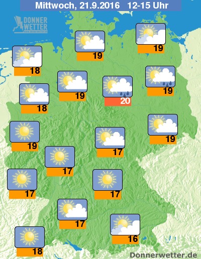 Die Temperaturen erreichen Werte um 16 Grad C im Alpenvorland und um 20 Grad C in Hannover.