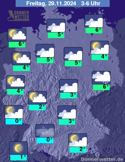 In der Nacht zum Freitag verlagern sich die Niederschlagsgebiete in den Südosten Deutschlands, im höheren Bergland fällt auch Schnee. Sonst bleibt es verbreitet stark, in der Westhälfte auch gering bewölkt. Gebietsweise kann sich Nebel bilden.