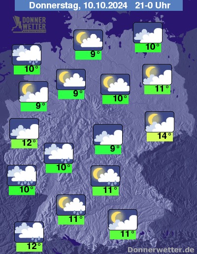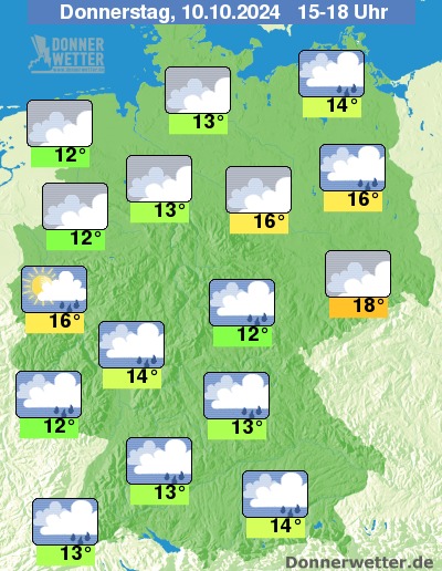 Am Donnerstagnachmittag zeigt sich der Himmel verbreitet wechselnd oder stark bewölkt, dabei ist vebreitet mit Schauern zu rechnen. Überwiegend trocken bleibt es am Nachmittag in der Nordwesthälfte.