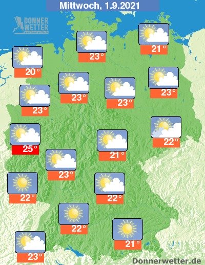 Am Mittwoch präsentiert sich das Wetter verbreitet heiter oder sonnig, gebietsweise ziehen auch mal einige Wolken durch, jedoch bleibt es landesweit trocken. Die Temperatur steigt auf 20 Grad in Emden und bis 25 Grad in Bonn.