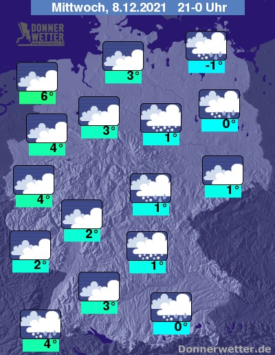 Am späten Abend und in der ersten Nachthälfte zeigt sich der Himmel über dem Nordwesten anfangs noch aufgelockert bewölkt, sonst ist es über weiten Landesteilen bedeckt. Im Süden und Osten muss dabei immer wieder mit Schneeregen oder Schnee gerechnet werden, in der Westhälfte bleibt es dagegen überwiegend trocken.