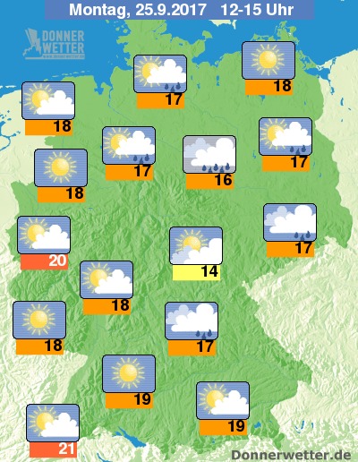 Heute Nachmittag ziehen über die Nordosthälfte Deutschlands sowie über den Norden Bayerns meist dichte Wolken hinweg, die hier wiederholt Schauer und auch örtliche Gewitter bringen. In den übrigen Landesteilen herrscht hingegen meist ruhiges und oft freundliches und dazu trockenes Frühherbstwetter. DIe Temperatur liegt bei 14 Grad in Erfurt und bis 21 Grad in Freiburg.