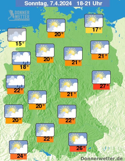 Heute Abend scheint im Südosten noch häufig die Sonne, auch über der übrigen Südosthälfte kann sich zwischen den Wolken noch die Sonne zeigen und es bleibt trocken. Weiter nach Nordwesten hin werden die Wolken dichter und es fällt auch zeitweise Regen. Die Temperatur liegt bei 15 Grad in Wilhelmshaven und 27 Grad in Dresden.