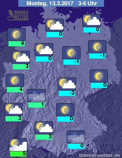 In der folgenden Nacht ist der Himmel vor allem über der Osthälfte verbreitet sternenklar, aber auch weiter nach Westen hin ist es meist nur leicht bewölkt und zum Teil ebenfalls sternenklar, dabei bleibt es trocken. Die Temperatur sinkt auf 5 Grad in Freiburg und bis auf -2 Grad im Eichsfeld.