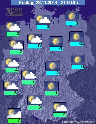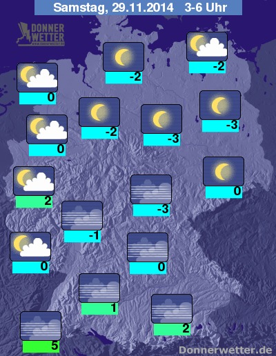 In der Nacht zum Samstag ist der Himmel im Norden und Osten meist sternenklar, sonst ist es verbreitet gering oder locker bewölkt, dabei bleibt es trocken. Stellenweise bildet sich Nebel oder Hochnebel. Die Temperatur sinkt auf 5 Grad in Freiburg und bis -3 Grad in Magdeburg.