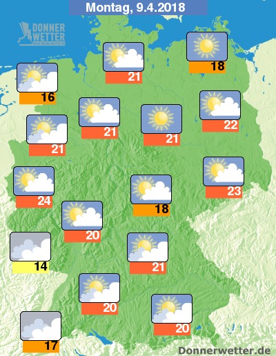 Am Montag ist es im Norden und Osten verbreitet heiter bis sonnig. Deutlich wolkiger zeigt sich insbesondere der Südwesten, aber auch über dem Süden und Westen ist es teils stark, sonst wechselnd bis aufgelockert bewölkt. Bei 14 Grad am Pfälzer Wald und bis 24 Grad in Köln bleibt es bundesweit trocken.