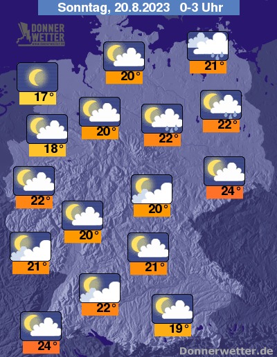 In der Nacht auf Sonntag zeigt sich der Himmel verbreitet locker oder aufgelockert bewölkt; in der Nordosthälfte sind einzelne Hitzegewitter nicht ausgeschlossen, sonst bleibt es meist trocken.