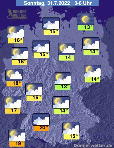 In der folgenden Nacht zeigt sich der Himmel oft stark, gebietsweise aber auch aufgelockert bewölkt, dabei bleibt es weitgehend trocken. Die Temperatur sinkt auf tropische 20 Grad in Stuttgart und bis 13 Grad in Neubrandenburg.