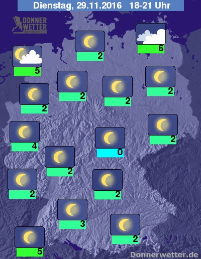 Heute Abend ziehen im Ost- und häufig auch im Nordseeumfeld dichte Wolken heran, die jedoch keinen nennenswerten Niederschlag bringen. Im großen Rest der Republik zeigt sich der Himmel hingegen sternenklar, dazu bleibt es trocken. Die Temperatur liegt bei 0 bis 6 Grad.