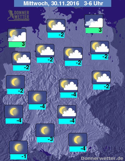 In der Nacht zum Mittwoch halten sich im Ostseeumfeld weitgehend dichte Wolken, die hier und da etwas Regen bringen können, auch im übrigen Norden und Osten ziehen zunehmend einige, meist noch lockere Wolken durch. Überwiegend sternenklar ist es hingegen über dem Süden und Westen Deutschlands, dazu bleibt es trocken. Die Temperatur sinkt auf 3 Grad in Emden und bis -4 Grad im Raum München.