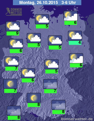 In der folgenden Nacht ist der Himmel über Süddeutschland verbreitet sternenklar, stellenweise kann sich jedoch Nebel oder Hochnebel ausbilden. Im übrigen Bundesgebiet ist es oft aufgelockert, häufig aber auch stark bewölkt. Es bleibt landesweit trocken bei Tiefstwerten von 9 Grad an der Nordsee und bis 4 Grad im nördlichen Brandenburg.